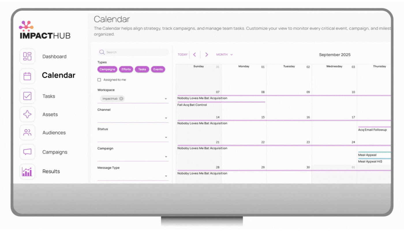 Fundraisers, marketers, and agencies told us the same story: scattered assets, chaotic calendars, and no connection to results. The Hub is the only marketing ops engine built for nonprofits to solve these pains. We’re here to help. Schedule a time to talk that works for you.